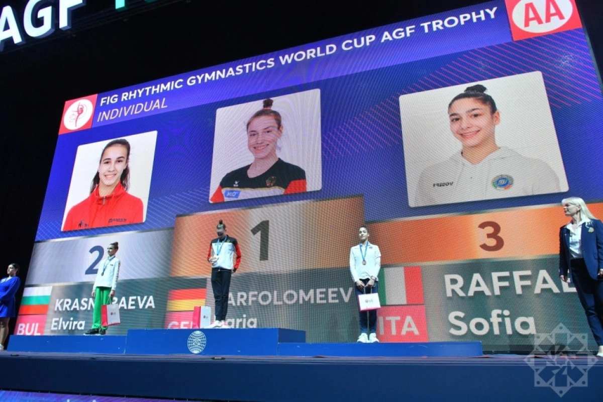 Как сообщает АПА, золотую медаль в многоборье завоевала чемпионка мира из Германии Дарья Варфоломеева, серебряную - Эльвира Краснобаева из Болгарии, а бронзовую - другая чемпионка мира из Италии София Раффаэли.