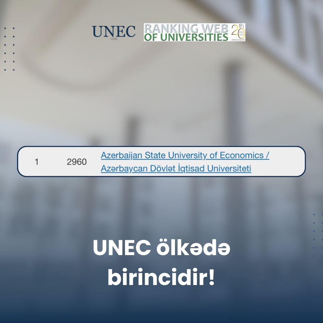 Таким образом, UNEC вошел в ряд 10 процентов лучших университетов мира. Также UNEC поднялся на 972 место среди 5985 университетов Европы и на 206 место среди 2692 университетов Центральной Восточной Европы.