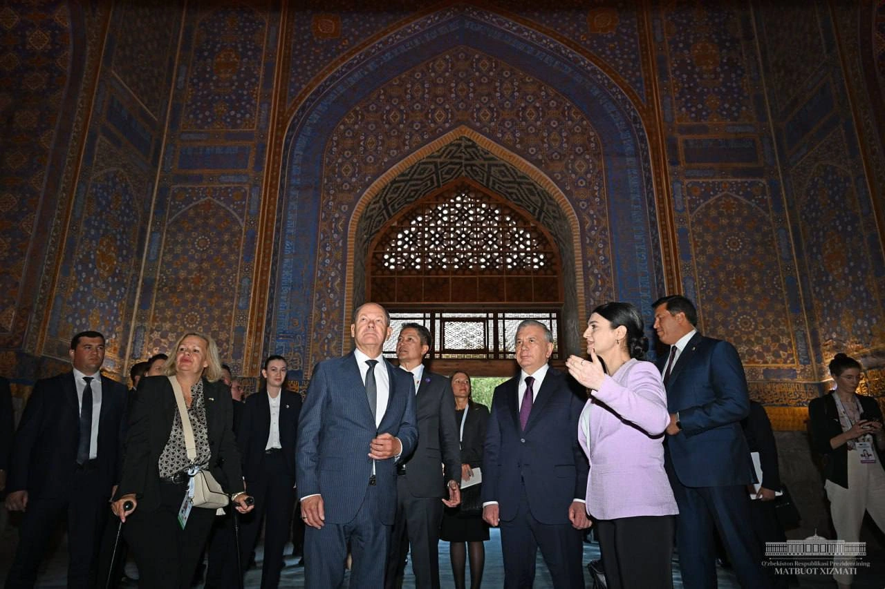 Олаф Шольц был подробно ознакомлен с историческими фактами строительства этой жемчужины восточного зодчества, особенностями архитектурных решений и декора, знаковыми событиями и личностями, связанными с этим местом, а также культурным наследием узбекского народа.