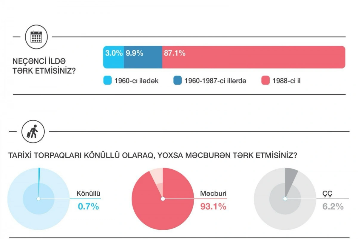 Итоги опроса, проведенного Центром социальных исследований среди выходцев из Западного Азербайджана, свидетельствуют о том, что 93,1% выходцев из Западного Азербайджана были изгнаны со своих исторических земель.
