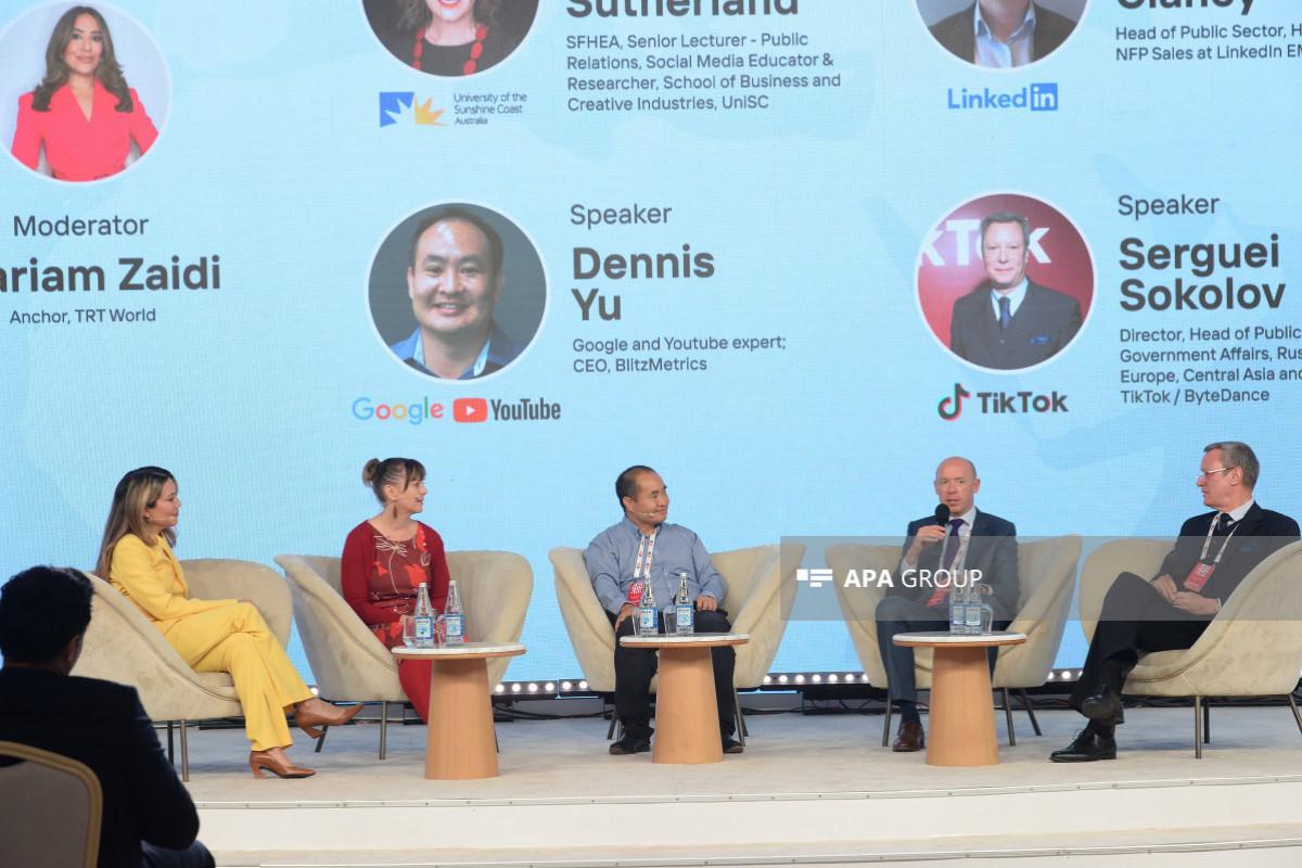 Как сообщает командированный в Шушу корреспондент АПА, в панельной дискуссии приняли участие старший преподаватель по связям с общественностью, инструктор по социальным сетям и исследователь Школы бизнеса и креативных индустрий Университета Саншайн-Кост (UniSC) в Австралии Карен Сазерленд, директор отдела общественной политики и государственного управления по России, Восточной Европе, Центральной Азии и Монголии компании TikTok/Bytedance Сергей Соколов, эксперт по Google и YouTube, генеральный директор компании BlitzMetrics Деннис Ю, а также руководитель общественного сектора, секторов здравоохранения и некоммерческих продаж компании LinkedIn по регионам EMEA (Европа, Ближний Восток и Африка) и LATAM (Латинская Америка) Симас Клэнси.
